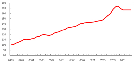 2008年4月中原(廣州)領(lǐng)先指數(shù)為166,環(huán)比輕微下降0.1個(gè)百分點(diǎn)。經(jīng)歷了2007年大起大落的行情后,中原(廣州)指數(shù)在2008年2月份開始保持平穩(wěn)的走勢(shì),連續(xù)三個(gè)月波動(dòng)幅度僅在0.1%左右。廣州房價(jià)在去年的9、10月份達(dá)到高峰,而隨著信貸調(diào)控措施的出臺(tái),二手住宅價(jià)格在去年的12月份進(jìn)入低谷,但隨即觸底反彈,到本月,二手住宅成交價(jià)格已基本穩(wěn)定。
