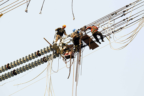 5月26日,在河南省博愛縣境內(nèi),我國首條百萬伏級特高壓試驗示范輸電線路工程的施工人員進行高空架線作業(yè)。