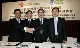 6月2日,中國聯(lián)通董事長兼首席執(zhí)行官常小兵(右二)、中國網(wǎng)通董事長兼首席執(zhí)行官左迅生(左二)、中國網(wǎng)通執(zhí)行董事兼首席財務官李福申(左一)與中國聯(lián)通執(zhí)行董事兼首席財務官佟吉祿出席新聞發(fā)布會。當日,中國聯(lián)通股份有限公司(中國聯(lián)通)與中國網(wǎng)通集團(香港)有限公司(中國網(wǎng)通)在香港聯(lián)合宣布,雙方將通過換股方式實施合并。中國聯(lián)通還宣布,將向中國電信出售CDMA業(yè)務。(新華社記者:周磊