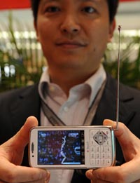 日前,中國首個(gè)移動(dòng)多媒體體驗(yàn)中心在北京中關(guān)村揭幕,這標(biāo)志著中國的移動(dòng)多媒體廣播全面進(jìn)入商用時(shí)代。北京奧運(yùn)會(huì)期間,人們可以通過手機(jī)等便攜電子產(chǎn)品隨時(shí)隨地看奧運(yùn)比賽。圖為創(chuàng)毅視訊科技有限公司工作人員在展示用手機(jī)收看電視。 |
