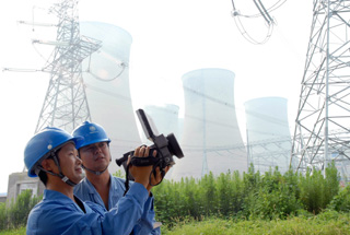 安徽淮南供電職工利用紅外線測(cè)溫儀對(duì)大唐洛河發(fā)電廠輸往華東電網(wǎng)線路進(jìn)行監(jiān)測(cè),確保電網(wǎng)安全運(yùn)行。新華社發(fā)(陳彬