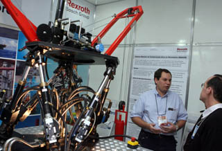 在巴西東南部城市里約熱內(nèi)盧,一位參展商(左)在2008年里約石油天然氣展上向觀眾介紹鉆井設(shè)備。2008年里約石油天然氣展日前舉行,來(lái)自世界各地的800多家油氣產(chǎn)品公司前來(lái)參展。