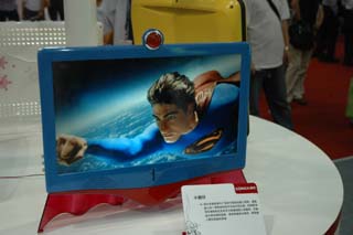 在日前舉行的第十屆中國國際高新技術(shù)成果交易會上,康佳集團(tuán)推出了幾款專門給孩子看的個性化彩電,有仿摩托車的“小騎士”彩電,有像小女孩的布娃娃和公主裙的“小可愛”彩電。圖為“小超仔”彩電,借鑒超人的一些明顯特征作為設(shè)計元素,采用紅色半透明的亞克力來展現(xiàn)超人的披風(fēng)。
