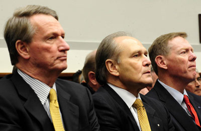 11月19日,美國通用汽車公司董事會(huì)主席、首席執(zhí)行官喬治·理查德·瓦戈納(左一)、克萊斯勒汽車公司首席執(zhí)行官羅伯特·納爾代利和福特汽車公司首席執(zhí)行官艾倫·穆拉利(右一)在華盛頓國會(huì)山出席眾議院金融委員會(huì)就美國汽車工業(yè)救援方案舉行的聽證會(huì)。本報(bào)記者:張巖