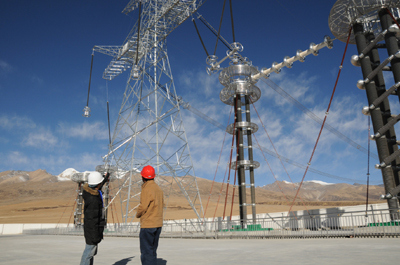 國家電網(wǎng)公司西藏高海拔試驗研究基地日前在海拔4300米的西藏拉薩市羊八井鎮(zhèn)投入運行。西藏電力“高原孤島”狀況有望結(jié)束。圖為電力工作者在檢查+1000kv直流電壓發(fā)生器。