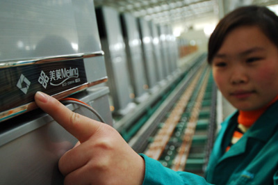 美菱集團2007年、2008年連續(xù)兩年被商務(wù)部列入“家電下鄉(xiāng)”企業(yè)。美菱針對農(nóng)民的實際需求,在產(chǎn)品設(shè)計上,特別采用防潮防銹材料,增加了節(jié)能、寬電壓啟動等個性化功能,并采用適合農(nóng)村路況的包裝設(shè)計。圖為工作人員介紹一款“家電下鄉(xiāng)”冰箱的特殊標識。