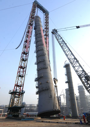 中國(guó)石化集團(tuán)第四建設(shè)公司日前將天津100萬(wàn)噸/年乙烯及配套工程高107.85米,吊裝重量達(dá)1800噸的第二丙烯精餾塔,一次吊裝就位成功。圖為第二丙烯精餾塔即將被吊裝就位。