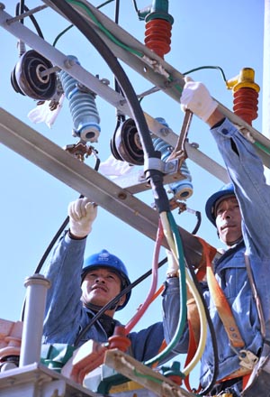 2007年以來,福建省武夷山市供電公司加快實施農(nóng)村電氣化建設(shè),無償提供近千萬元資金進(jìn)行線路整改、專用線架設(shè)、新建變電站等電網(wǎng)建設(shè),改變了過去農(nóng)村用電難、用電貴的局面。圖為電力工人在福建省武夷山市星村鎮(zhèn)黃村村架設(shè)電網(wǎng)。