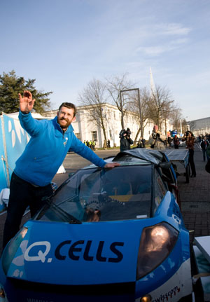 12月4日,瑞士青年帕爾馬駕駛他的“太陽能的士”(SOLAR TAXI)抵達波蘭波茲南聯(lián)合國氣候變化大會會場。 “太陽能的士”是人類歷史上第一個以太陽能為動力環(huán)游世界的交通工具。帕爾馬自2007年7月3日從瑞士盧塞恩啟程后,迄今已行駛5.2萬公里,途徑38個國家和地區(qū)。 因為帕爾馬在旅途中總是以自己的太陽能汽車搭乘一名路人,所以被稱為“太陽能的士”。