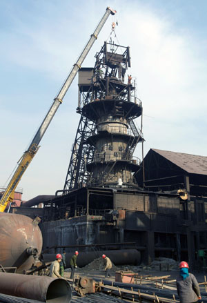 為貫徹落實(shí)國(guó)家節(jié)能減排方針,淘汰落后產(chǎn)能,改善大氣環(huán)境,河北邢臺(tái)開始拆除兩座220立方米高爐,此次拆除可有效改善當(dāng)?shù)丨h(huán)境質(zhì)量。圖為12月23日邢臺(tái)市龍海鋼鐵集團(tuán)的一座高爐設(shè)施被拆除。