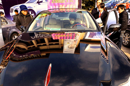 1月2日,杭州市民在觀看一位試車者體驗紅旗轎車性能。當(dāng)日,杭州舉行“2009汽車超市迎新年”車展,汽車經(jīng)銷企業(yè)展示了紅旗、吉利、長城、奧迪和玲木等熱銷家用轎車,吸引了許多杭州市民前往參觀選購。