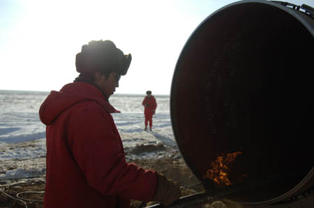 中國(guó)農(nóng)歷牛年大年初一,中國(guó)石油天然氣管道局中亞管道項(xiàng)目部職工在哈薩克斯坦江布爾州施工現(xiàn)場(chǎng)為即將焊接的管道加熱。中亞天然氣管道項(xiàng)目起自土庫(kù)曼斯坦和烏茲別克斯坦邊境的格達(dá)伊姆,途經(jīng)烏茲別克斯坦、哈薩克斯坦最終到達(dá)中國(guó)境內(nèi)的霍爾果斯。管道實(shí)行雙線同時(shí)建設(shè),總長(zhǎng)3600多公里,設(shè)計(jì)年輸氣規(guī)模300億立方米。該項(xiàng)目預(yù)計(jì)2009年底實(shí)現(xiàn)單管通氣并與中國(guó)境內(nèi)的西氣東輸二線連接。 |
