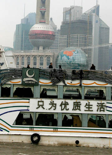 上海市環(huán)保局日前發(fā)布的信息顯示,截至2008年底,上海市的5976臺燃煤設施實施了清潔能源替代,已超標完成中心城區(qū)674平方公里面積“基本無燃煤區(qū)”創(chuàng)建,上海市空氣質量已連續(xù)6年保持85%以上優(yōu)良率。圖為一艘游覽觀光客輪從黃浦江上駛過。
