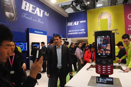 日前,世界移動通信大會在西班牙巴塞羅那舉行,本次大會匯集了世界各大電信運營商、增值服務(wù)提供商和設(shè)備制造商,共有來自世界各地的1280多家公司參展。圖為三星公司展區(qū)內(nèi)碩大的手機模型非常引人注目。