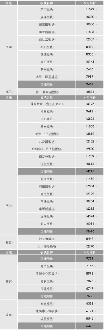 深圳市各區(qū)域、板塊均價(單元:元/平方米)