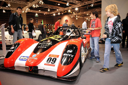 參觀者在車展上觀看一輛RADICAL SR3汽車。