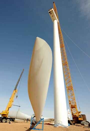圖為施工人員正在內(nèi)蒙古巴彥淖爾市烏拉特后旗烏力吉風(fēng)電場吊裝風(fēng)機。到2010年,內(nèi)蒙古風(fēng)電裝機容量將達到500萬千瓦以上。本報記者:張領(lǐng)