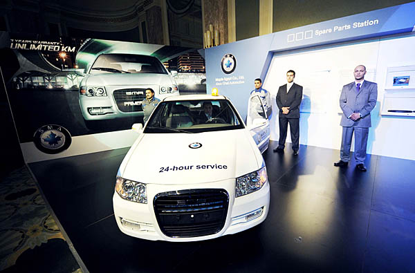 2月25日,上海華普汽車(chē)有限公司在埃及首都開(kāi)羅舉行新車(chē)發(fā)布儀式,旗下的Primera、Romeo、Escala三款車(chē)型正式投放埃及市場(chǎng)。圖為幾名工作人員在展示即將投放埃及市場(chǎng)的上海華普Primera汽車(chē)。