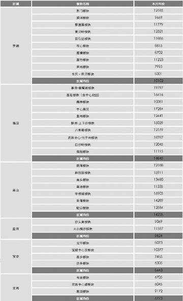 深圳市各區(qū)域、各板塊均價(jià)(單位:元/平方米)