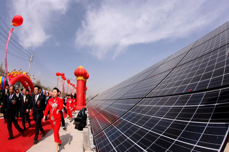 國內首座大型太陽能光伏高壓并網電站日前在青海省西寧市舉行竣工典禮并運行發(fā)電,這標志著青海省太陽能光伏發(fā)電并入城市電網技術達到了國際先進水平。這座光伏高壓并網電站位于西寧市經濟技術開發(fā)區(qū),占地面積15畝,安裝太陽能電池組件300千瓦,年發(fā)電量可達45萬千瓦時。本報記者:楊壽德 攝 |