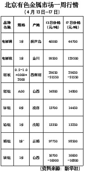 北京有色金屬市場(chǎng)一周行情[04.13—04.17]