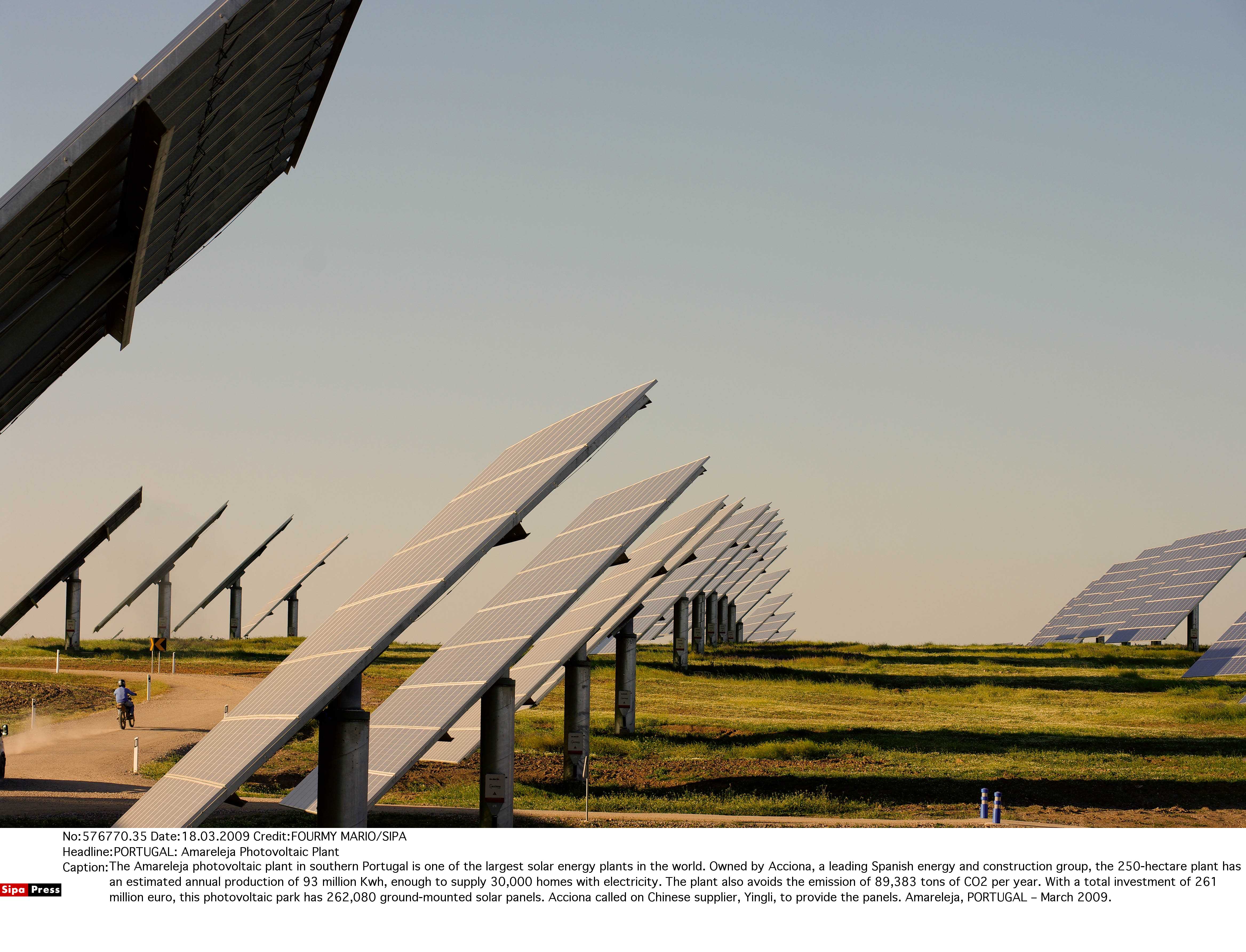 葡萄牙阿馬雷萊雅太陽能發(fā)電廠。占地250公頃的阿馬雷萊雅太陽能發(fā)電廠是世界上最大的太陽能發(fā)電廠之一,預(yù)計(jì)年發(fā)電量為9300萬千瓦,可供3萬個(gè)家庭用電。該廠每年可減少二氧化碳排量89383噸。新華社/西霸
