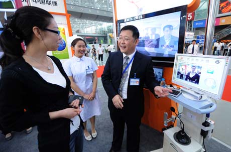 5月14日,一名參展人員(右)向觀眾介紹可通過(guò)3G網(wǎng)絡(luò)等信息技術(shù)搭建的醫(yī)療行業(yè)移動(dòng)應(yīng)用平臺(tái)。 當(dāng)日,為期4天的2009年天津國(guó)際手機(jī)產(chǎn)業(yè)展覽會(huì)暨論壇在天津?yàn)I海新區(qū)拉開(kāi)帷幕。摩托羅拉、海爾、索愛(ài)等20多家整機(jī)制造商在展覽會(huì)上發(fā)布了新品手機(jī)。國(guó)內(nèi)三大運(yùn)營(yíng)商推出的3G新業(yè)務(wù)成為展覽會(huì)上最大亮點(diǎn)。