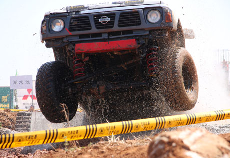 5月23日,參賽車輛在山東棗莊薛城國際賽車場上駛出深水池。新華社發(fā)(孫中喆 攝)