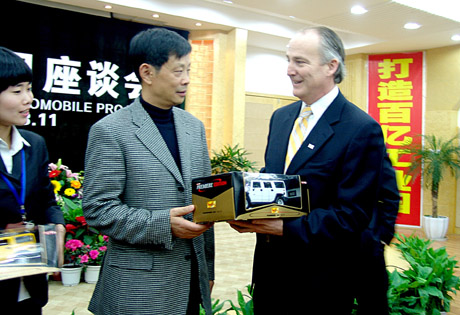 今年3月11日,悍馬首席執(zhí)行官JimTaylor在四川德陽與騰中重工老板和德陽當?shù)卣賳T舉行了會談。這是JimTaylor向德陽市委書記方小方贈送悍馬車模。 新華社發(fā)黃建培攝 |