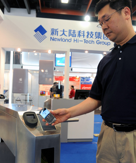日前,在臺(tái)北國(guó)際電腦展上,工作人員展示新大陸科技集團(tuán)研發(fā)的自動(dòng)識(shí)別系統(tǒng),乘客通過(guò)手機(jī)就可以進(jìn)出地鐵站。
