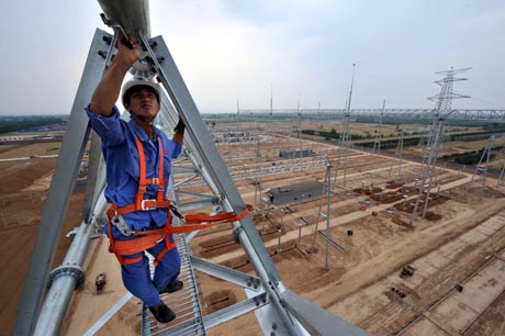 6月16日,在山西稷山500千伏輸變電工程工地上,建設工人在25米高的500千伏橫梁上作業(yè)。 山西稷山500千伏輸變電工程是山西省電網(wǎng)改造的重點工程之一,工程總投資約11億元。目前,500千伏輸變電工程土建工程基本完成,已進入電氣安裝階段,預計2009年9月竣工投產。該工程建成投入運行后,將大大提高山西省北電南送的能力。