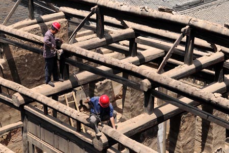6月29日,工人們在明清古民居群異地遷建工地施工。 近日,河南省焦作市文物局開始對南水北調中線工程焦作市區(qū)段地上文物西王褚村明清民居建筑群進行整體異地遷建。西王褚村明清民居建筑群是研究焦作地區(qū)明清民居的建筑手法及明末清初焦作工商業(yè)發(fā)展的實物依據(jù)。