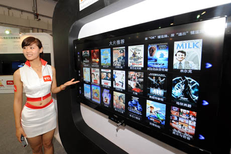 在日前舉行的2009中國(guó)國(guó)際消費(fèi)電子博覽會(huì)(SINOCES)上,一位家電模特介紹遠(yuǎn)程家庭數(shù)碼影院播放系統(tǒng)。 |