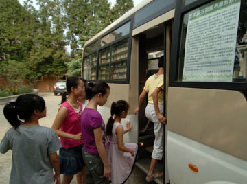 8月16日,安徽合肥市少年兒童圖書館的“汽車圖書館”滿載千余冊少兒讀物來到合肥高新區(qū)江河社區(qū)的工人子弟身邊,使遠在郊區(qū)的廣大小讀者不用到圖書館就能享受到借閱圖書的方便。新華社發(fā)