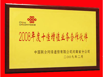 英泰利智榮獲河南聯(lián)通“2008年度十佳增值業(yè)務(wù)合作伙伴”