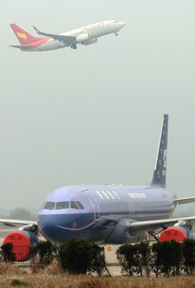 2009年3月27日,在武漢天河國(guó)際機(jī)場(chǎng),一架民營(yíng)祥鵬航空的航班從已停航13天的東星航空的飛機(jī)上空飛過(guò)。周國(guó)強(qiáng)