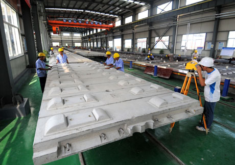 8月25日,中鐵十局嘉興軌道板場的技術人員正在查驗下線完工的首批軌道板。 當日,滬杭高鐵首批80多塊軌道板在中鐵十局嘉興軌道板場的第一條生產線上下線完工,為滬杭鐵路的按期開通奠定了基礎。該板是目前世界生產工藝最先進的鐵路軌道板,能保證高速列車以300多公里的時速平穩(wěn)運行。