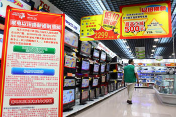 日前,天津市全面展開家電以舊換新工作。據(jù)天津市商務(wù)委有關(guān)負(fù)責(zé)人介紹,家電銷售企業(yè)和回收企業(yè)已經(jīng)通過招標(biāo)方式確定向社會公布,消費(fèi)者可在交售舊家電購買新家電時(shí)享受家電補(bǔ)貼。此次列入家電以舊換新補(bǔ)貼產(chǎn)品范圍的品種有電視機(jī)、電冰箱,洗衣機(jī)、空調(diào)、電腦。圖為天津一家電賣場在顯著位置擺放家電以舊換新宣傳展板。 新華社發(fā)