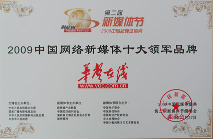 華聲在線榮獲“2009中國(guó)網(wǎng)絡(luò)新媒體十大領(lǐng)軍品牌”獲獎(jiǎng)證書