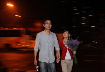 圖為5月15日晚,逛完“人居展”后盧俏(右)手持蔣新偉花10元錢買的一把干花走在杭州市區(qū)一條街道上。新華社記者 韓傳號 攝