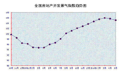 5月份,全國(guó)房地產(chǎn)開(kāi)發(fā)景氣指數(shù)(簡(jiǎn)稱“國(guó)房景氣指數(shù)”)為105.07,比4月份回落0.59點(diǎn),比去年同期提高9.13點(diǎn)。