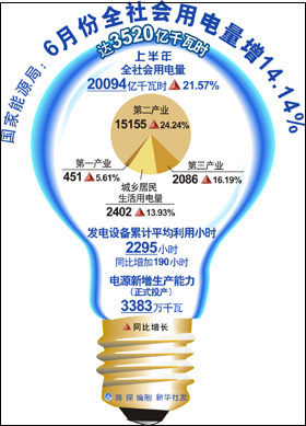 6月份,全社會(huì)用電量3520億千瓦時(shí),同比增長(zhǎng)14.14%,增速比5月份下降6.66個(gè)百分點(diǎn),環(huán)比增長(zhǎng)1.1%。1至6月,全社會(huì)用電量20094億千瓦時(shí),同比增長(zhǎng)21.57%。從分類用電量看,第一產(chǎn)業(yè)451億千瓦時(shí),增長(zhǎng)5.61%;第二產(chǎn)業(yè)15155億千瓦時(shí),增長(zhǎng)24.24%;第三產(chǎn)業(yè)2086億千瓦時(shí),增長(zhǎng)16.19%;城鄉(xiāng)居民生活用電2402億千瓦時(shí),增長(zhǎng)13.93%。 記者注意到,單月同比增長(zhǎng)14.14%是今年各月同比增速中最緩的,今年前5個(gè)月已經(jīng)連續(xù)維持了20%以上的同比增速。 國(guó)家電網(wǎng)能源研究院副院長(zhǎng)胡兆光表示,從6月的用電量增速減緩看來(lái),我國(guó)經(jīng)濟(jì)正在做一個(gè)理性的回歸,“之前連續(xù)數(shù)月20%以上的增速在歷史上是罕見(jiàn)的,去年上半年的基數(shù)較低是主要原因,在中央一攬子計(jì)劃刺激下,2009年6月用電量同比增速正式轉(zhuǎn)正,所以會(huì)造成今年用電量增速前高后低的情況,”胡兆光告訴《經(jīng)濟(jì)參考報(bào)》記者。 6月全社會(huì)用電量的同比增速是14.14%,胡兆光認(rèn)為到今年底還會(huì)繼續(xù)釋放回歸,增速還會(huì)往下走。“如果到了年底大家發(fā)現(xiàn)用電量月度增幅在2%至6%之間,也不要覺(jué)得奇怪和可怕,政府在金融危機(jī)期間做了一些大的手段調(diào)控使得用電量出現(xiàn)了較大的波幅,往后的增幅逐步減小正好表明了中國(guó)經(jīng)濟(jì)逐步趨穩(wěn)!焙坠庹f(shuō)。 國(guó)家倡導(dǎo)并嚴(yán)格執(zhí)行的節(jié)能減排政策被眾多專家認(rèn)為是包括眾多高耗能行業(yè)在內(nèi)的重工業(yè)用電量增速環(huán)比下降較多的一個(gè)重要原因。 華北電力大學(xué)校長(zhǎng)助理張粒子教授告訴《經(jīng)濟(jì)參考報(bào)》記者,“前一陣國(guó)家嚴(yán)格執(zhí)行對(duì)高耗能企業(yè)的差別電價(jià)政策對(duì)重工業(yè)的用電量有一定影響,政府對(duì)一些高耗能產(chǎn)業(yè)的宏觀調(diào)控手段初見(jiàn)成效”。 中投顧問(wèn)能源行業(yè)首席研究員姜謙認(rèn)為,目前是實(shí)現(xiàn)“十一五”期間單位GDP能耗下降20%目標(biāo)的關(guān)鍵時(shí)期,各部委相繼出臺(tái)多項(xiàng)舉措,對(duì)鋼鐵、有色、電力、建材、石化等重點(diǎn)行業(yè),采用取消優(yōu)惠電價(jià)、執(zhí)行差別電價(jià)、加大對(duì)高耗能企業(yè)關(guān)停力度等多種手段加以抑制。“此外,寧夏、四川、浙江等多個(gè)省區(qū)自6月1日起相繼取消對(duì)高耗能行業(yè)的優(yōu)惠電價(jià),由此必然導(dǎo)致區(qū)內(nèi)高耗能企業(yè)減少用電量。這也是6月份全國(guó)重工業(yè)用電量同比增速大幅回落的重要因素!苯t告訴《經(jīng)濟(jì)參考報(bào)》記者。 電監(jiān)會(huì)研究室的吳疆研究員提醒《經(jīng)濟(jì)參考報(bào)》記者,不要光看重工業(yè)的用電量增速減緩這一個(gè)數(shù)據(jù),“重工業(yè)用電量絕對(duì)量和占全社會(huì)用電量比例的環(huán)比下降,更可以說(shuō)明一些問(wèn)題。” 記者比較了5月份的《全國(guó)電力工業(yè)統(tǒng)計(jì)數(shù)據(jù)》,在6月份全國(guó)全社會(huì)用電量、第一產(chǎn)業(yè)、輕工業(yè)、第三產(chǎn)業(yè)、城鄉(xiāng)居民生活全面較5月份正增長(zhǎng)的情況下,6月的重工業(yè)用電量絕對(duì)量環(huán)比下降17億千瓦時(shí),占全社會(huì)用電量比例環(huán)比下降1.22%。