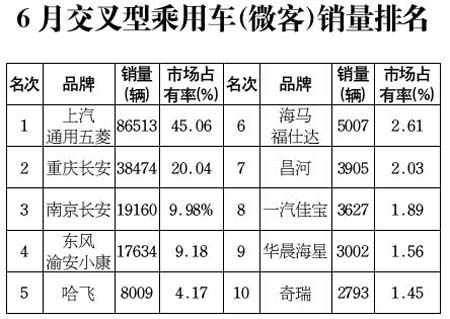 PV市場。 從6月份微客的銷售情況來看,排在前10名的品牌共銷售188124輛,占交叉型乘用車企業(yè)總銷量的98%。從排名情況看,排在前六名的品牌名次與上月沒有變化;奇瑞由上月的第七降為第十,華晨海星由上月的第八降為第九,昌河由上月的第九升為第七,上月第十的吉奧跌出十強(qiáng),一汽佳寶進(jìn)入十強(qiáng),排名第八。 6月微客市場的最大特征是五菱系列的產(chǎn)銷回調(diào),其產(chǎn)量已經(jīng)低于2月的低位,長安的產(chǎn)銷量也是年度的次低點(diǎn)位置。而這兩家的零售同比增長是行業(yè)內(nèi)最好的,其他廠家的壓力可想而知。前十名中僅有三個(gè)品牌(重慶長安、南京長安、東風(fēng)渝安小康)銷量上升,其中重慶長安增速最快,為32.03%。其余均下降,奇瑞和華晨海星下降最快,分別為51.07%和30.19%。 如果把2009年的暴增體現(xiàn)為不合時(shí)宜的需求異常波動(dòng),那么未來微客市場的增長壓力會(huì)很大,新進(jìn)入廠家的低銷量就是客觀的寫照。 |