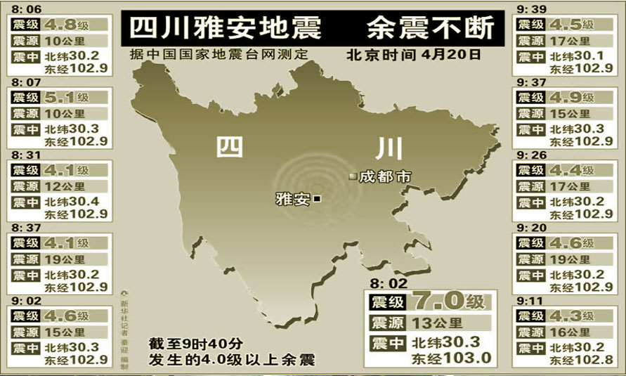 雅安市位于川藏、川滇公路交會(huì)處,距成都120公里。雅安市位于下轄雨城區(qū)、名山區(qū)、滎經(jīng)、漢源、石棉、天全、蘆山、寶興6縣2區(qū)。全市幅員面積1.53萬(wàn)平方公里,總?cè)丝?53萬(wàn)。此次雅安地震屬于龍門山地震帶前山斷裂帶,該地震帶也與512地震有一定關(guān)聯(lián)性。2008年汶川大地震發(fā)生在歐亞大陸和印度次大陸共同作用下的地震帶,是在三種力量的作用下產(chǎn)生的。 |
