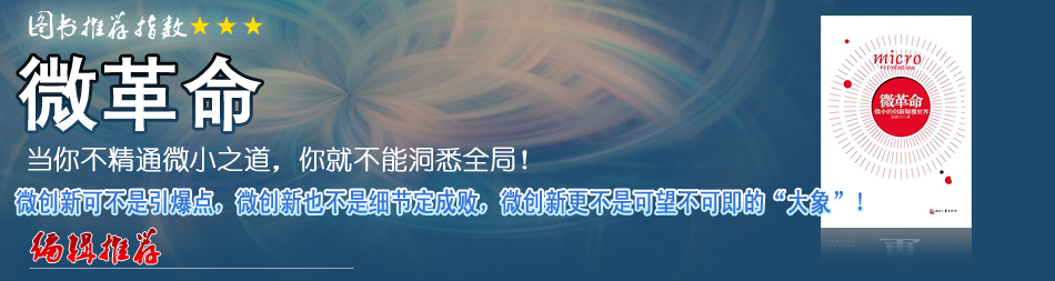 誰最應(yīng)該成為“微殺手”? 在人類社會(huì)的商業(yè)競(jìng)爭(zhēng)中,要想成為出奇制勝的“微殺手”靠什么?當(dāng)然要靠“微創(chuàng)新”了!拔(chuàng)新”與傳統(tǒng)的創(chuàng)新有何不同?更難還是更容易?有哪些規(guī)律和法則?這種“微創(chuàng)新”是否真的會(huì)引爆一場(chǎng)互聯(lián)網(wǎng)時(shí)代的“微革命”?對(duì)于所有類似問題,《微革命》一書都進(jìn)行了有血有肉、令人信服且激蕩人心的回答。而我與這本書發(fā)生的“化學(xué)反應(yīng)”,則延伸到了更為廣闊復(fù)雜的社會(huì)生活、人文傳統(tǒng)等領(lǐng)域…[詳細(xì)] |