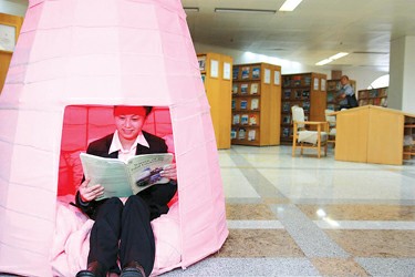 部分藝術(shù)品被置放在不起眼的角落。伴隨書香,在上海圖書館里與這些藝術(shù)品相遇令人意外。過(guò)道旁,一個(gè)粉紅圓帳篷,里面鋪著墊子,垂下一盞吊燈,這個(gè)溫馨小窩叫做“私人閱讀燈”,可以鉆進(jìn)去看書、靜思。設(shè)計(jì)師林天苗說(shuō):“我在公共閱覽室看書很容易走神,非常想要一個(gè)私密的閱讀空間,于是就創(chuàng)造了這個(gè)作品。”