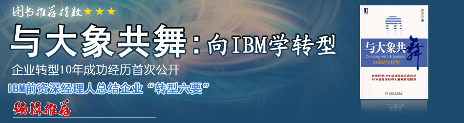 IBM的前董事長郭士納在他的自傳《誰說大象不能跳舞》里面告訴我們,作為“外行”,他怎么領(lǐng)導(dǎo)了一場轉(zhuǎn)型,IBM(中國)前高管許正在新書《與大象共舞--向IBM學轉(zhuǎn)型》里面告訴我們,作為身在其中的人,他感受到的成功轉(zhuǎn)型的六個要素!督(jīng)濟學人》雜志曾說,IBM的失敗總是被視為美國的失敗?梢,IBM的代表性。也因此,許正先生這本書中關(guān)于IBM的經(jīng)驗值得向企業(yè)界推薦。 |