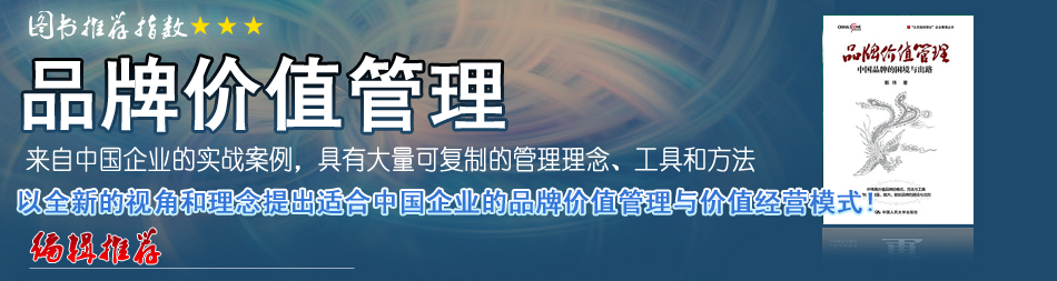 郭偉的新作《品牌價值管理》對中國品牌原創(chuàng)理論和實踐進行了非常堅實且卓有成效的探索,可喜可賀,值得推薦!全書還歸納出許多企業(yè)品牌建設的經(jīng)典案例,對企業(yè)決策者和品牌經(jīng)理人都是非常實用的教科書。 |
