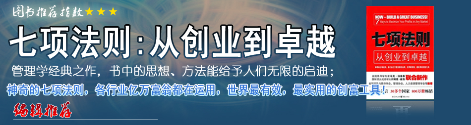 | 在《七項(xiàng)法則》中,印象最深刻的是“逆風(fēng)險(xiǎn)營銷”,這個(gè)思路讓我對目前正困惑的一個(gè)項(xiàng)目,有豁然開朗的感覺。它能指導(dǎo)人如何更好地創(chuàng)業(yè)、管理公司、更好地工作。 |