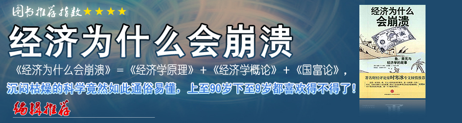 自高中時代以來,我就對經(jīng)濟(jì)學(xué)十分感興趣。于是,滿懷期待地來到大學(xué),希望對貨幣和經(jīng)濟(jì)政策有所了解?墒俏业奶彀!我簡直不知道他們在學(xué)校里都教了我們什么,那些莫名其妙的術(shù)語讓人覺得極端無聊,某位古怪糊涂的教授滿嘴專業(yè)詞匯喃喃自語,除了這些,我回憶不起來任何有價值的東西……當(dāng)我看到《經(jīng)濟(jì)為什么會崩潰》一書時,非常興奮。迄今為止,還沒有哪本經(jīng)濟(jì)學(xué)入門讀物能超越這本書。所有人都能在兩小時內(nèi)讀完它,都能明白當(dāng)今世界的貨幣政策和政府財政政策中的謬論,都清楚這些謬論正把我們引上毀滅之路。 |